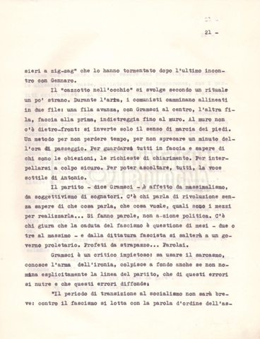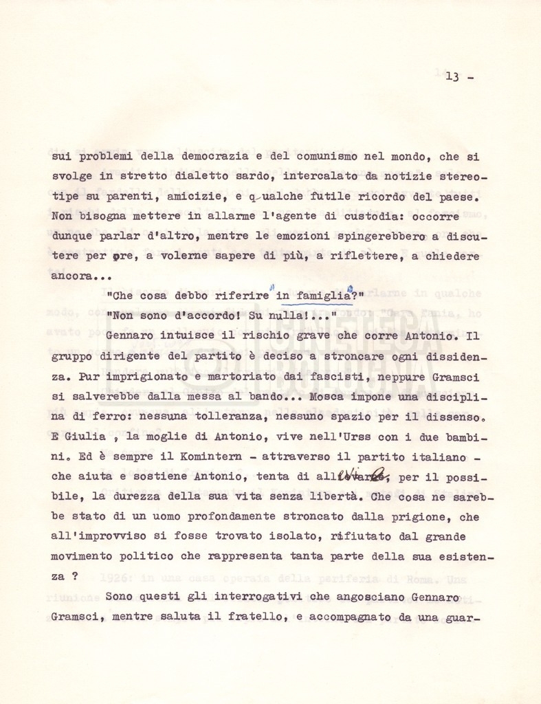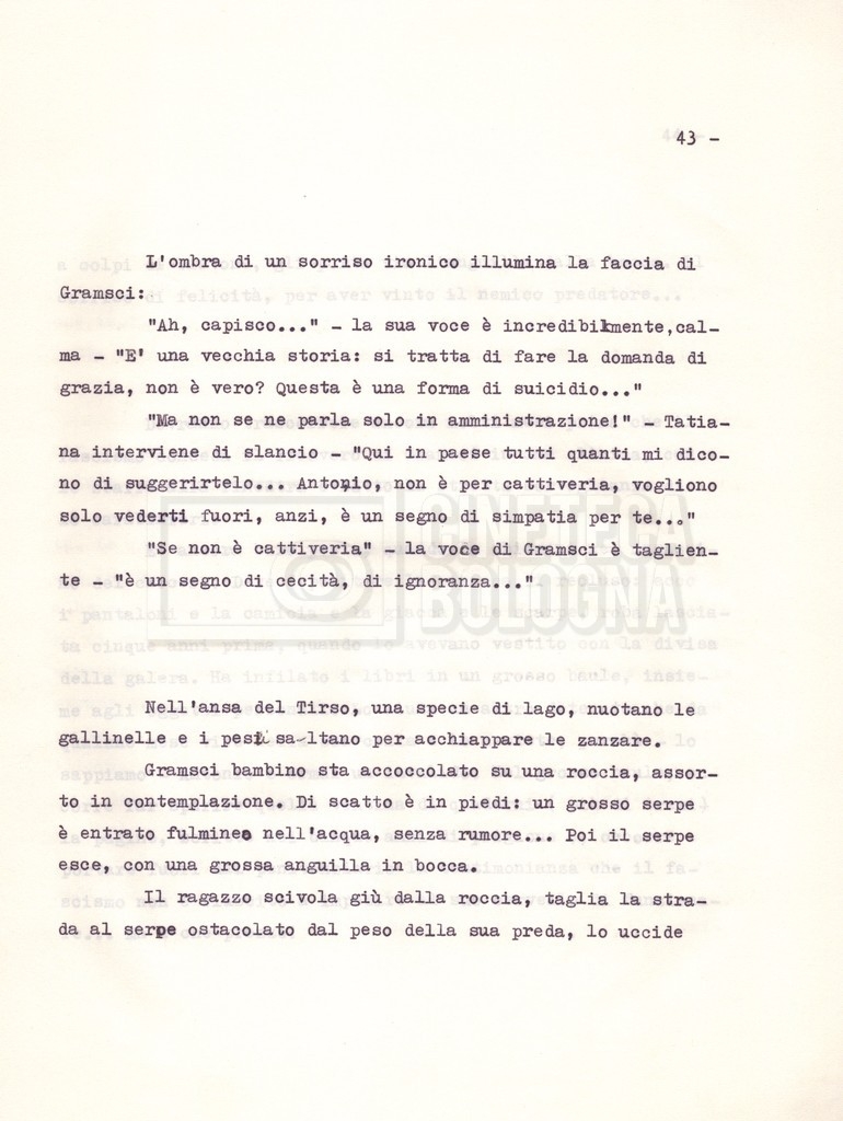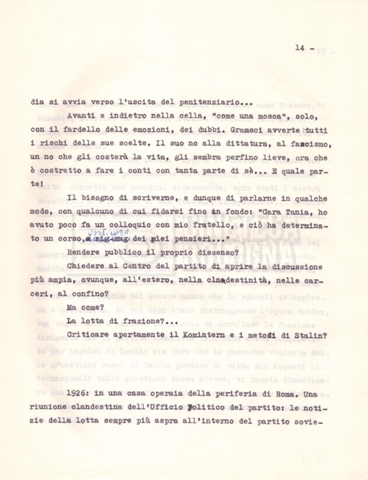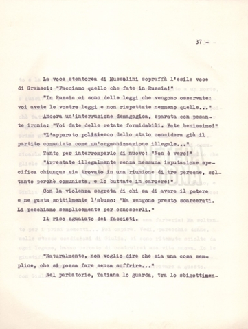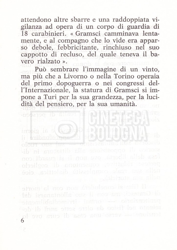 Torna alla banca dati “Il soggetto stampato; trattamento; trattamento in francese” Documento storico Fondo Cecilia Mangini – Lino Del Fra / “Film di fiction realizzati” / “Antonio Gramsci – I giorni del carcere” Ambiti e contenuto Contiene:– Tre copie del soggetto, a stampa;– Due copie del trattamento, di cui una in fotocopia;– Il trattamento in francese. Informazioni archivistiche Cronologia: 1976 Numero di ordinamento definitivo: 4.2.3 Numero di ordinamento provvisorio: 11.03 Descrizione fisica: fascicolo Immagini digitalizzate Informazioni sul film titolo originale: Antonio Gramsci – I giorni del carcere regia: Del Fra, Lino anno: 1977 paese di produzione: Italia lingua principale: italiana Documenti correlati Vai alla banca dati DOCUMENTO STORICO “Preventivo; piano di lavorazione (il primo)” DOCUMENTO STORICO “Prima versione sceneggiatura; scaletta desunta” DOCUMENTO STORICO “Diari di lavorazione” DOCUMENTO STORICO “Appunti per la sceneggiatura” DOCUMENTO STORICO “Ordini del giorno” DOCUMENTO STORICO “Il casting; gli ambienti” DOCUMENTO STORICO “Durante le riprese” DOCUMENTO STORICO “I titoli di testa; i titoli di coda; le percentuali di grandezza” DOCUMENTO STORICO “Lettere sul film; nota bene: presidente della Camera dei deputati era Sandro Pertini” DOCUMENTO STORICO “I contratti degli attori” DOCUMENTO STORICO “Scene soppresse” DOCUMENTO STORICO “Antonio Gramsci; copia edizione” DOCUMENTO STORICO “Antonio Gramsci; sceneggiatura” DOCUMENTO STORICO “Antonio Gramsci; copia doppiaggio” DOCUMENTO STORICO “Antonio Gramsci; dialoghi definitivi per il doppiaggio e per il ministero” DOCUMENTO STORICO “Materiale Italnoleggio” DOCUMENTO STORICO “Interviste a Lino Del Fra” DOCUMENTO STORICO “Riprese” DOCUMENTO STORICO “Corrispondenza con Claude Ledû” DOCUMENTO STORICO Rassegna stampa