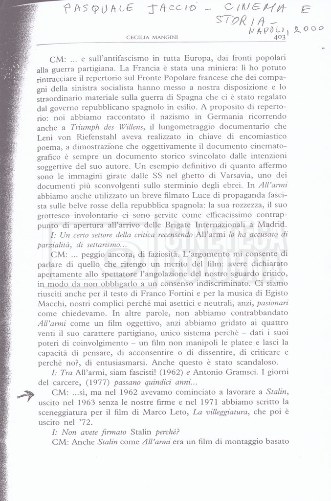 – Una intervista a Cecilia Mangini a opera di Pasquale Jaccio per il periodico “Cinema e storia” (2000);