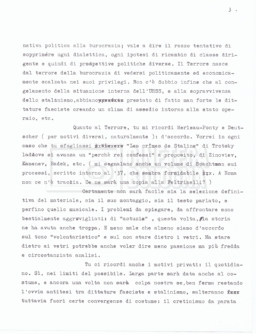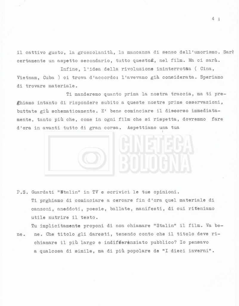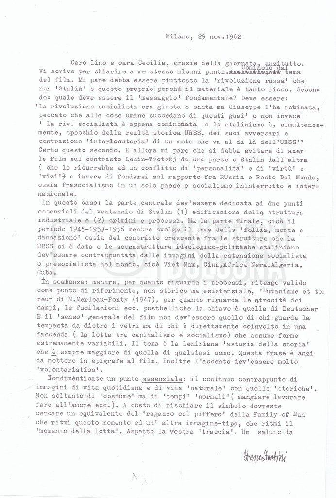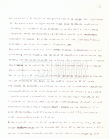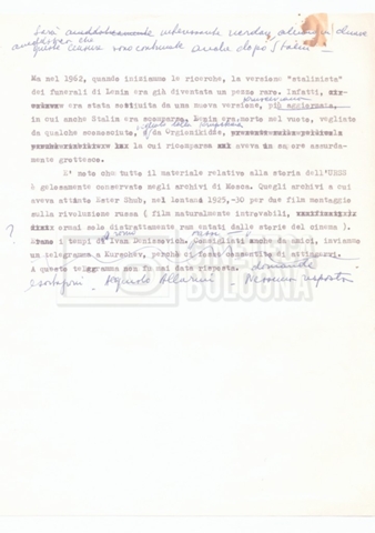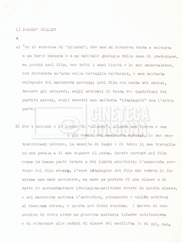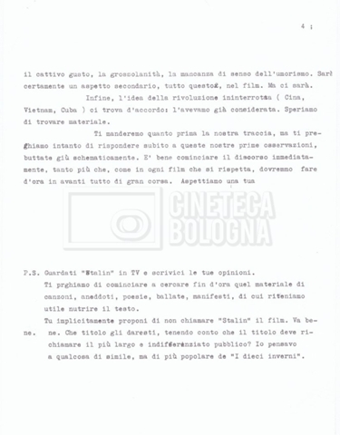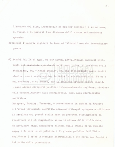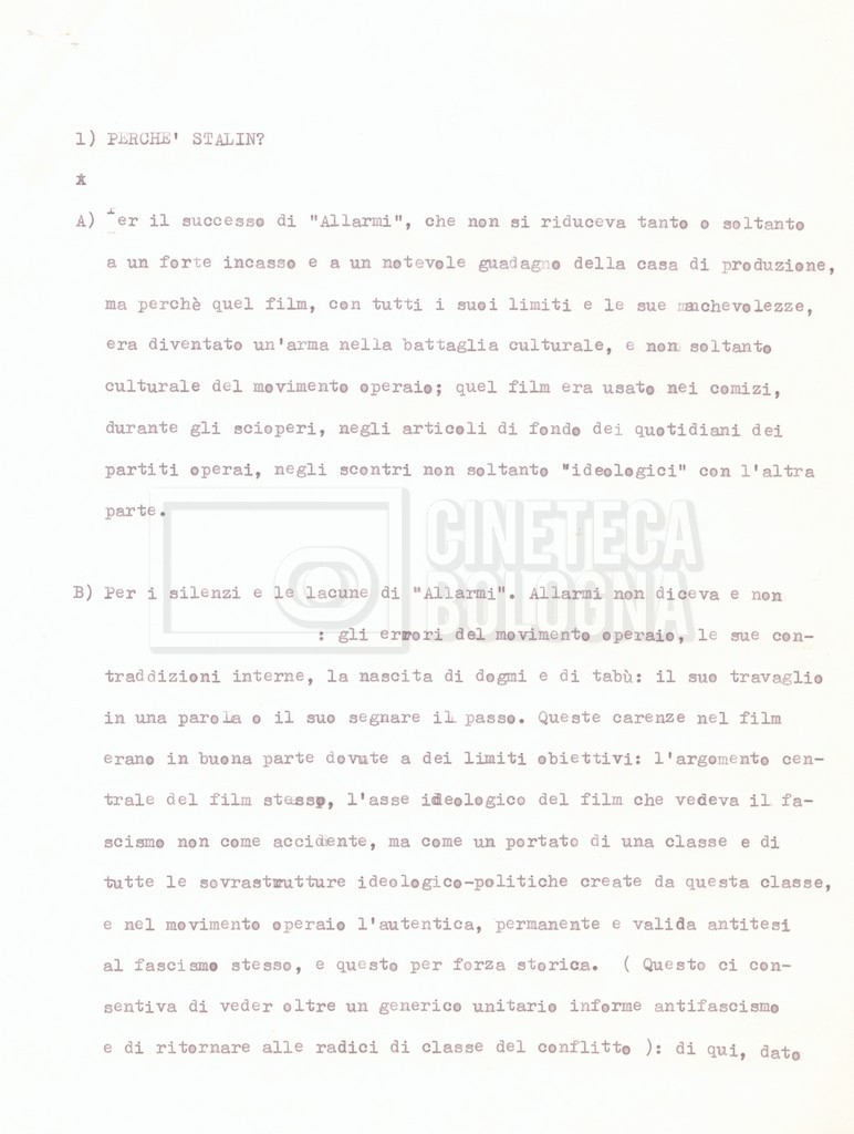 – Testo datt. dal titolo “Perché Stalin?” di Cecilia Mangini e Lino Del Fra, probabilmente preparati per la stampa, a cui è allegato un ulteriore doc. datt. dal titolo “Difficoltà nel reperimento del materiale”;