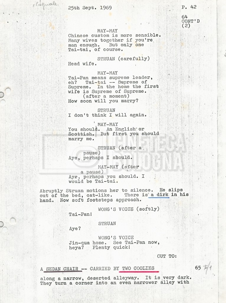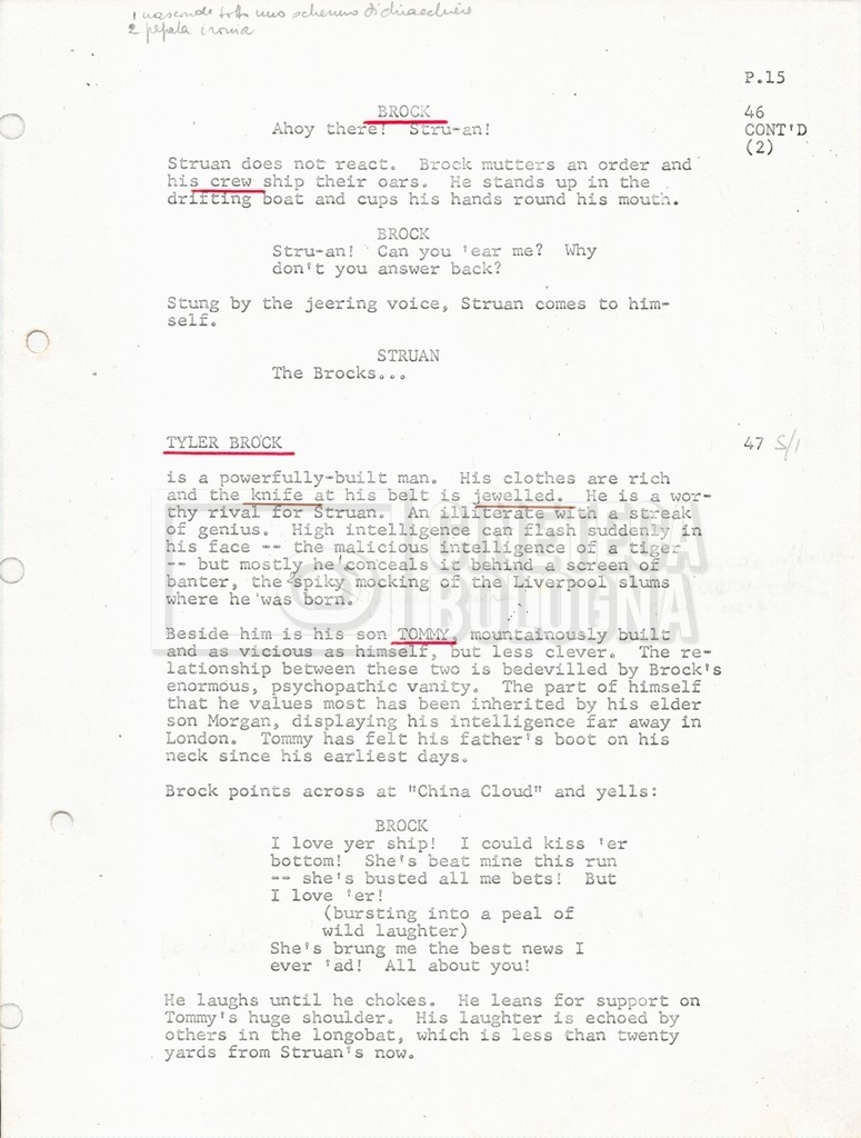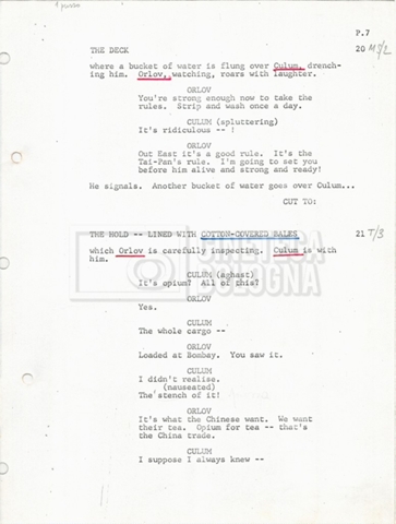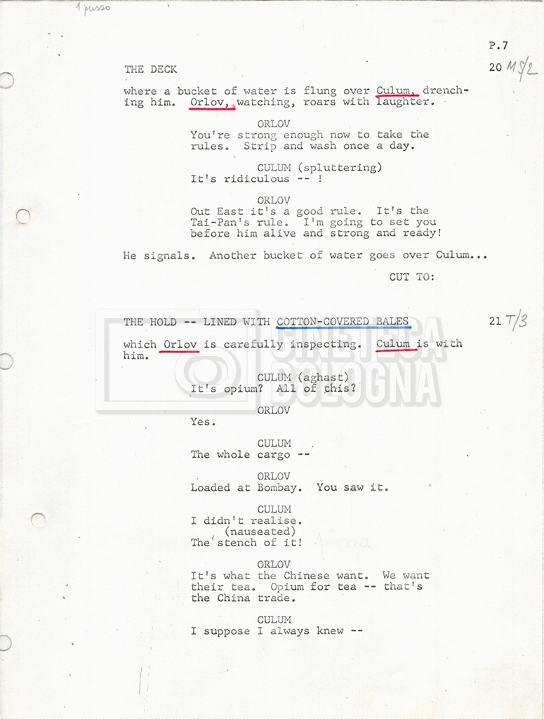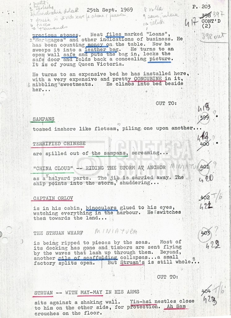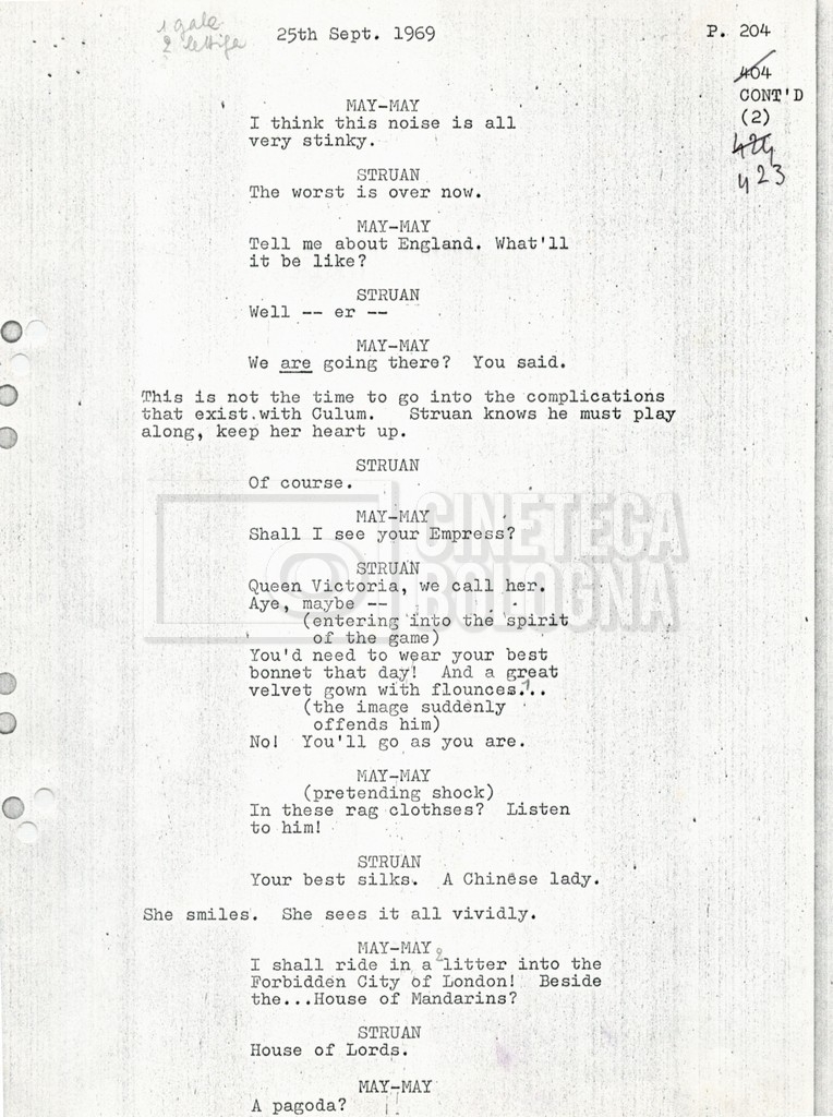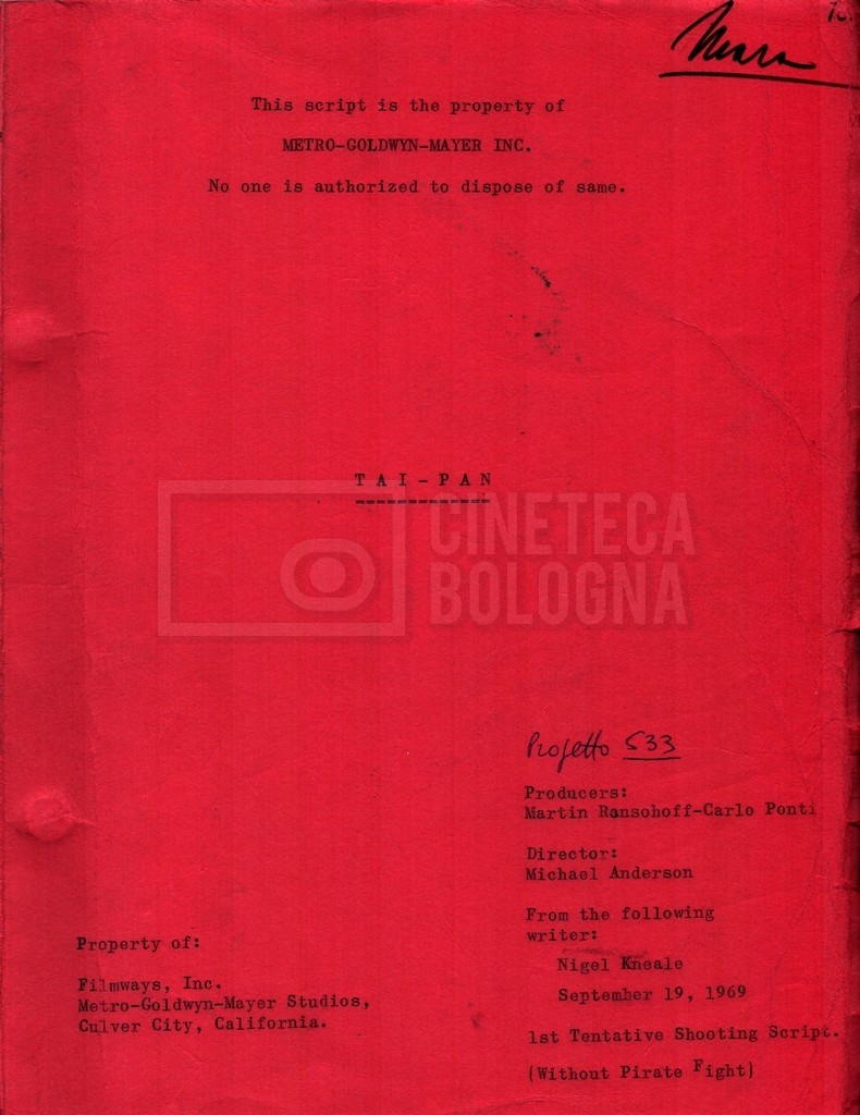 Torna alla banca dati “Tai-Pan, without pirate fight scene” Documento storico Fondo Mara Blasetti / “Film preparati ma non girati” / Tai-Pan Ambiti e contenuto L’autore è Nigel Kneale. Informazioni archivistiche Cronologia: 19 settembre 1969 Numero di ordinamento definitivo: 2.5.5 Numero di ordinamento provvisorio: M4.4 Descrizione fisica: volume Immagini digitalizzate Documenti correlati Vai alla banca dati DOCUMENTO STORICO “Cast e unit lists” DOCUMENTO STORICO “Tai-Pan breakdown e fogli per detto; piano di lavorazione a Tirrenia” DOCUMENTO STORICO “Estimate Tai-Pan, con molte note in fogli sciolti senza data” DOCUMENTO STORICO First tentative estimate budget con allegati DOCUMENTO STORICO “Tai-Pan, pirate fight sequence”