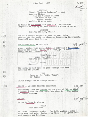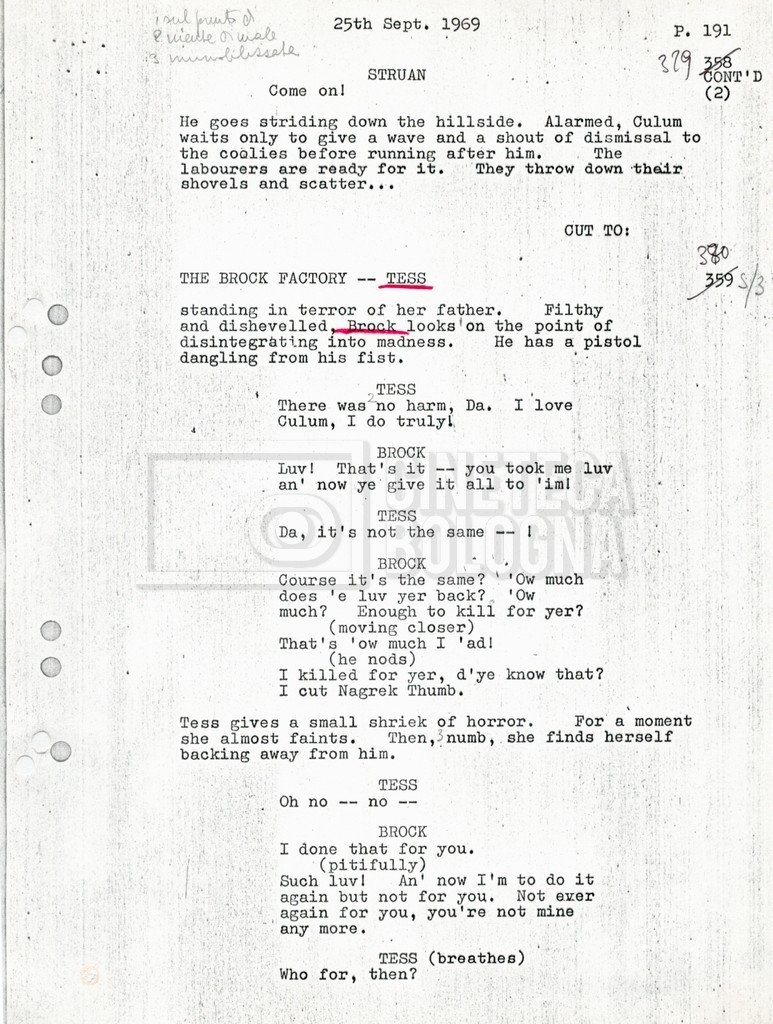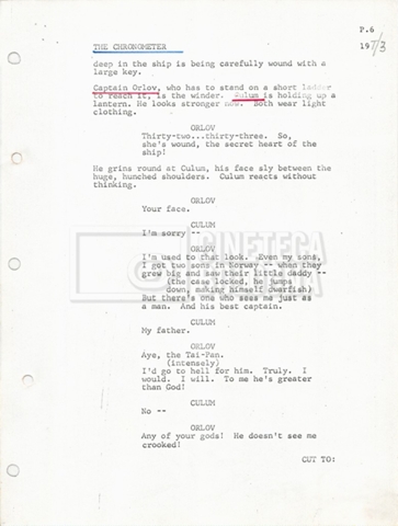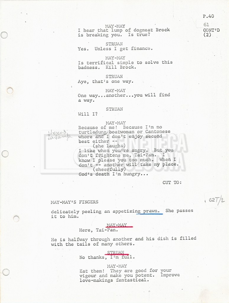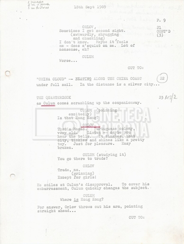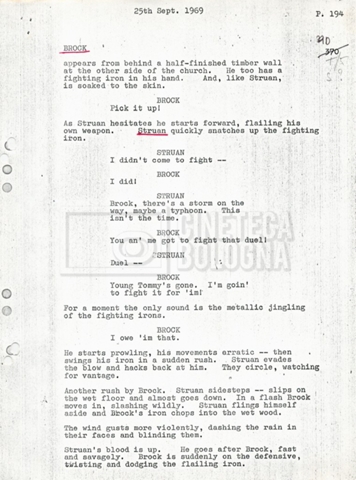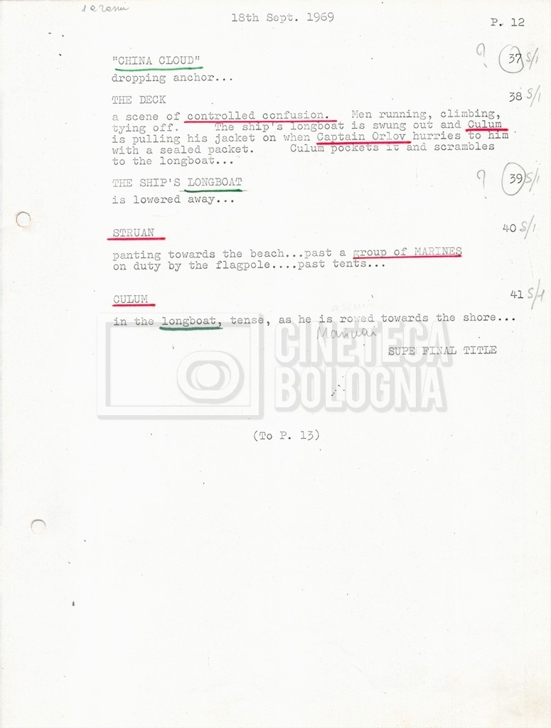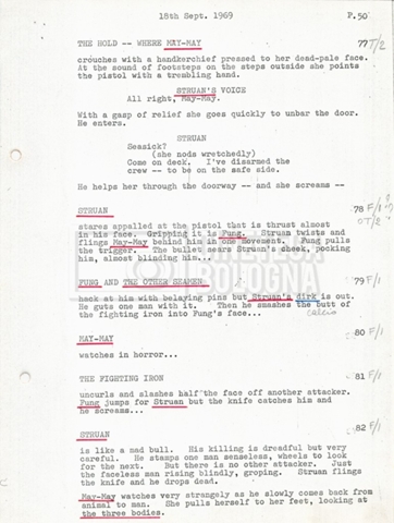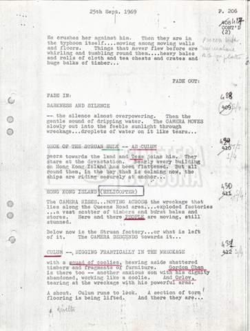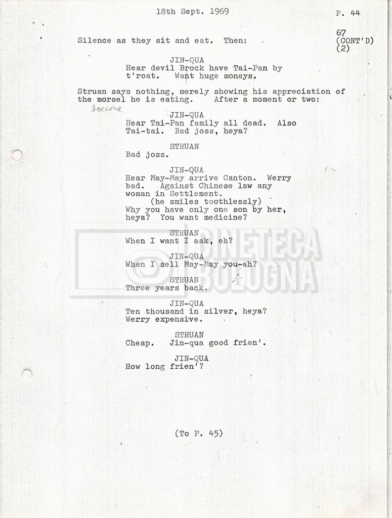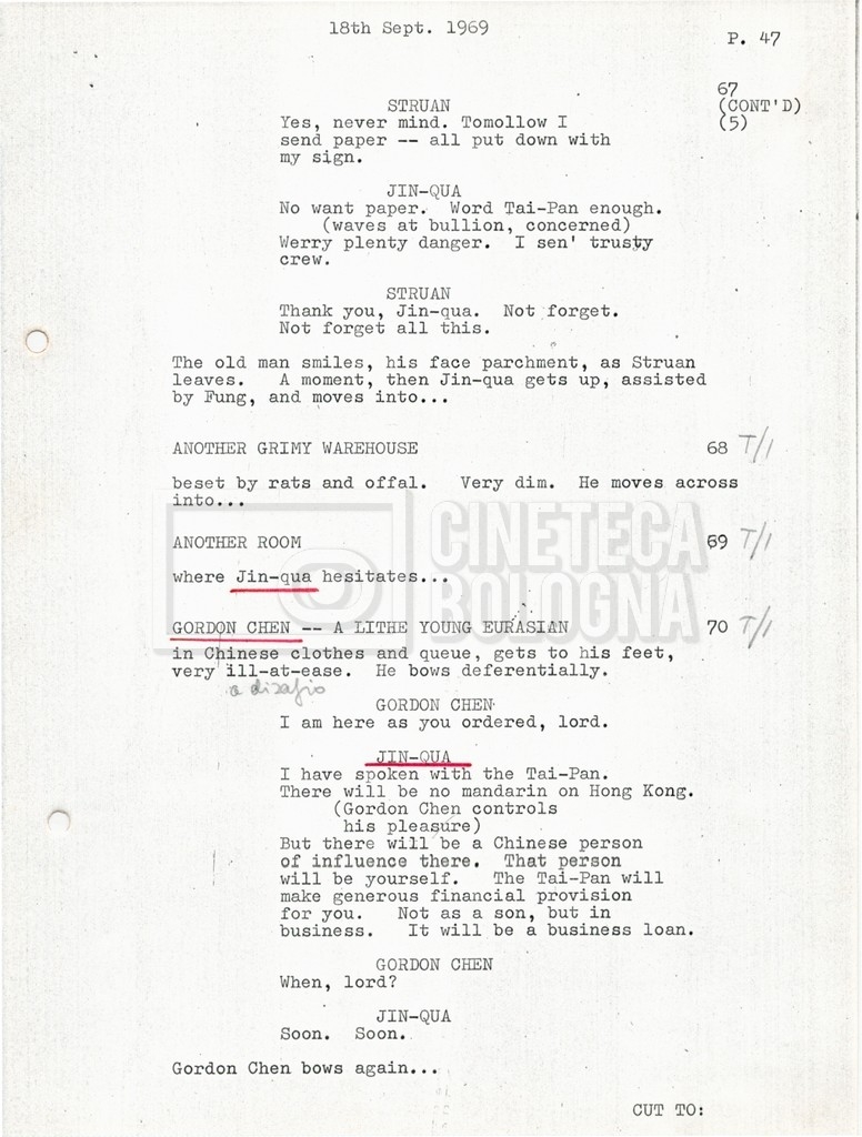 Torna alla banca dati “Tai-Pan, without pirate fight scene” Documento storico Fondo Mara Blasetti / “Film preparati ma non girati” / Tai-Pan Ambiti e contenuto L’autore è Nigel Kneale. Informazioni archivistiche Cronologia: 19 settembre 1969 Numero di ordinamento definitivo: 2.5.5 Numero di ordinamento provvisorio: M4.4 Descrizione fisica: volume Immagini digitalizzate Documenti correlati Vai alla banca dati DOCUMENTO STORICO “Cast e unit lists” DOCUMENTO STORICO “Tai-Pan breakdown e fogli per detto; piano di lavorazione a Tirrenia” DOCUMENTO STORICO “Estimate Tai-Pan, con molte note in fogli sciolti senza data” DOCUMENTO STORICO First tentative estimate budget con allegati DOCUMENTO STORICO “Tai-Pan, pirate fight sequence”
