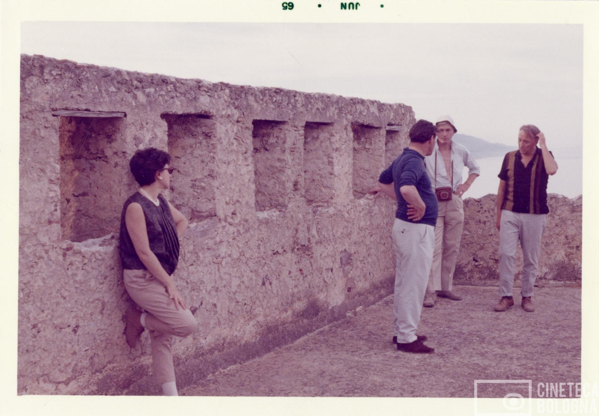 Taormina. Mara Blasetti, Joseph Losey, Richard McDonald e Spike Pigren durante i sopralluoghi del film Modesty Blaise