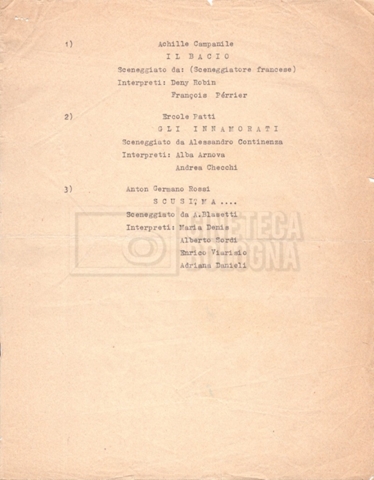 Torna alla banca dati Titoli di testa Documento storico Fondo Mara Blasetti / “Film Mara girati” / Tempi nostri Informazioni archivistiche Cronologia: 1953 Numero di ordinamento definitivo: 1.1.1 Numero di ordinamento provvisorio: 4.1.A Descrizione fisica: fascicolo Immagini digitalizzate Informazioni sul film titolo originale: Tempi nostri – Zibaldone n. 2 altri titoli: Tempi nostri – Quelques pas dans la vie – A Slice of Life – The Anatomy of Love regia: Blasetti, Alessandro anno: 1954 paese di produzione: Italia – Francia lingua principale: italiana