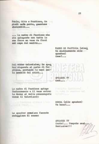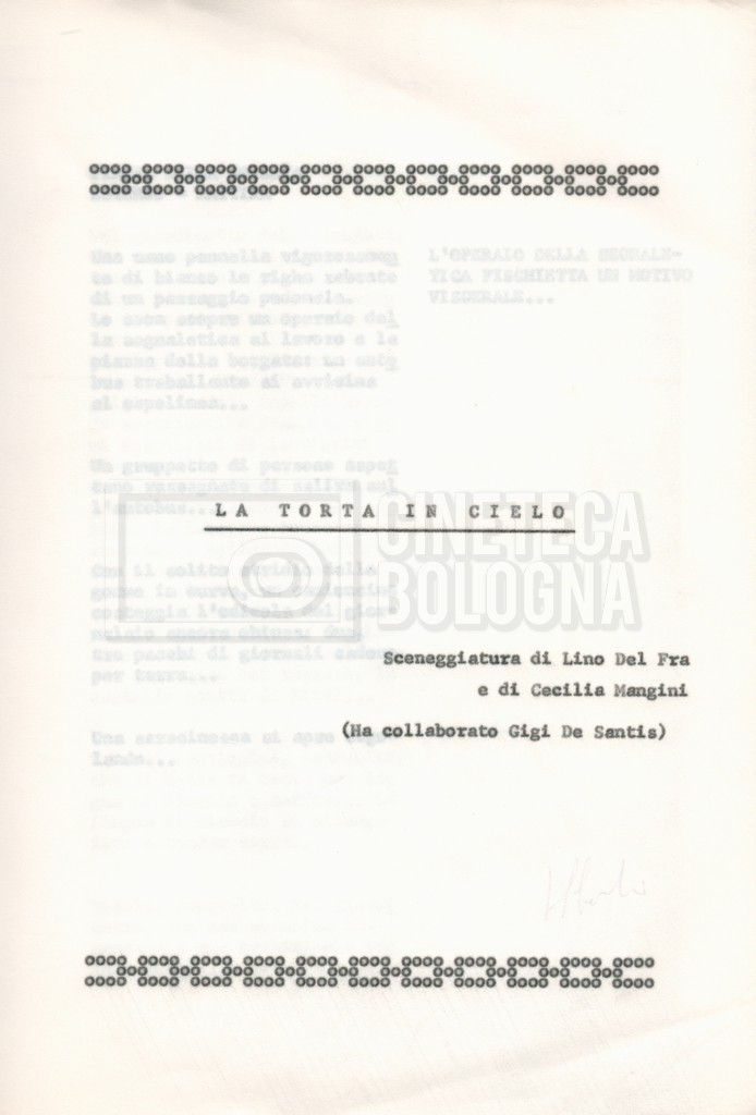 Torna alla banca dati “La torta in cielo” Documento storico Fondo Cecilia Mangini – Lino Del Fra / “Film di fiction realizzati” / “La torta in cielo” Informazioni archivistiche Cronologia: [1972] Numero di ordinamento definitivo: 4.1.12 Numero di ordinamento provvisorio: 61.02 Descrizione fisica: volume Immagini digitalizzate Informazioni sul film titolo originale: La torta in cielo regia: Del Fra, Lino anno: 1973 paese di produzione: Italia lingua principale: italiana Documenti correlati Vai alla banca dati DOCUMENTO STORICO “‘La torta in cielo’, il film che non si doveva fare” DOCUMENTO STORICO “Corrispondenza con l’Istituto Luce 1969-1973” DOCUMENTO STORICO “Preparazione” DOCUMENTO STORICO “La canzone della Saponaia” DOCUMENTO STORICO Corrispondenza DOCUMENTO STORICO “Dialoghi copia doppiaggio” DOCUMENTO STORICO “Schema del film finito” DOCUMENTO STORICO “Giudizi e valutazioni dei bambini dopo aver visto il film” DOCUMENTO STORICO “Rassegna stampa” DOCUMENTO STORICO Corrispondenza DOCUMENTO STORICO “Sunto del soggetto; le scalette; i suggerimenti di Luigi De Santis” DOCUMENTO STORICO “‘La torta in cielo’, copia di edizione” DOCUMENTO STORICO “Diario di lavorazione” DOCUMENTO STORICO “Dialoghi definitivi” DOCUMENTO STORICO Fotografie dei sopralluoghi DOCUMENTO STORICO Fotografie degli attori DOCUMENTO STORICO Gli ostacoli iniziali DOCUMENTO STORICO Durante le riprese DOCUMENTO STORICO Rassegna stampa sul blocco del film DOCUMENTO STORICO “Materiale Italnoleggio; manifesti; appunti e dichiarazioni di Lino Del Fra sul film”