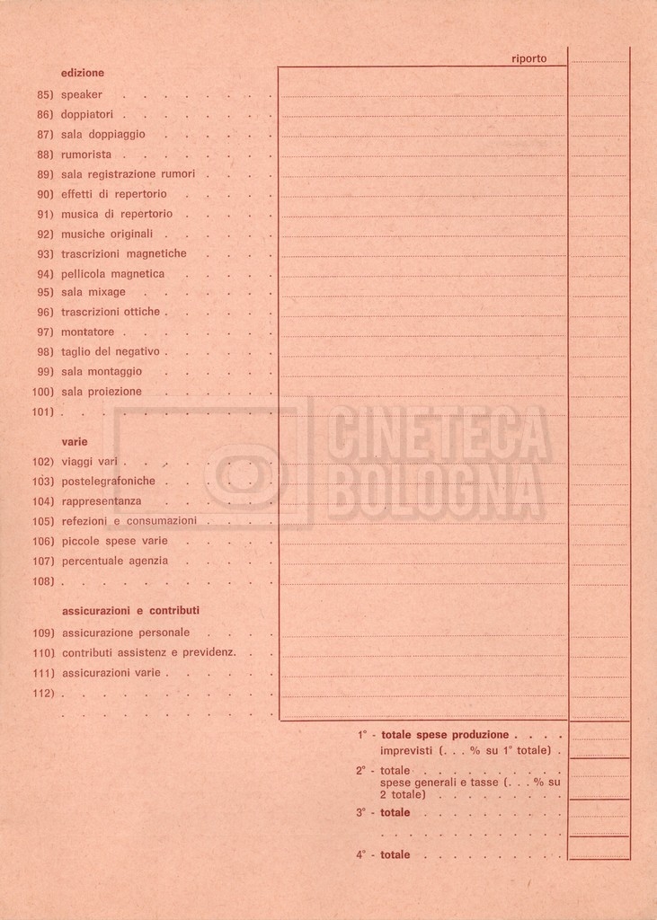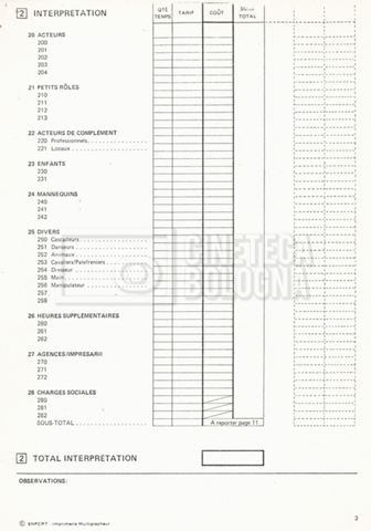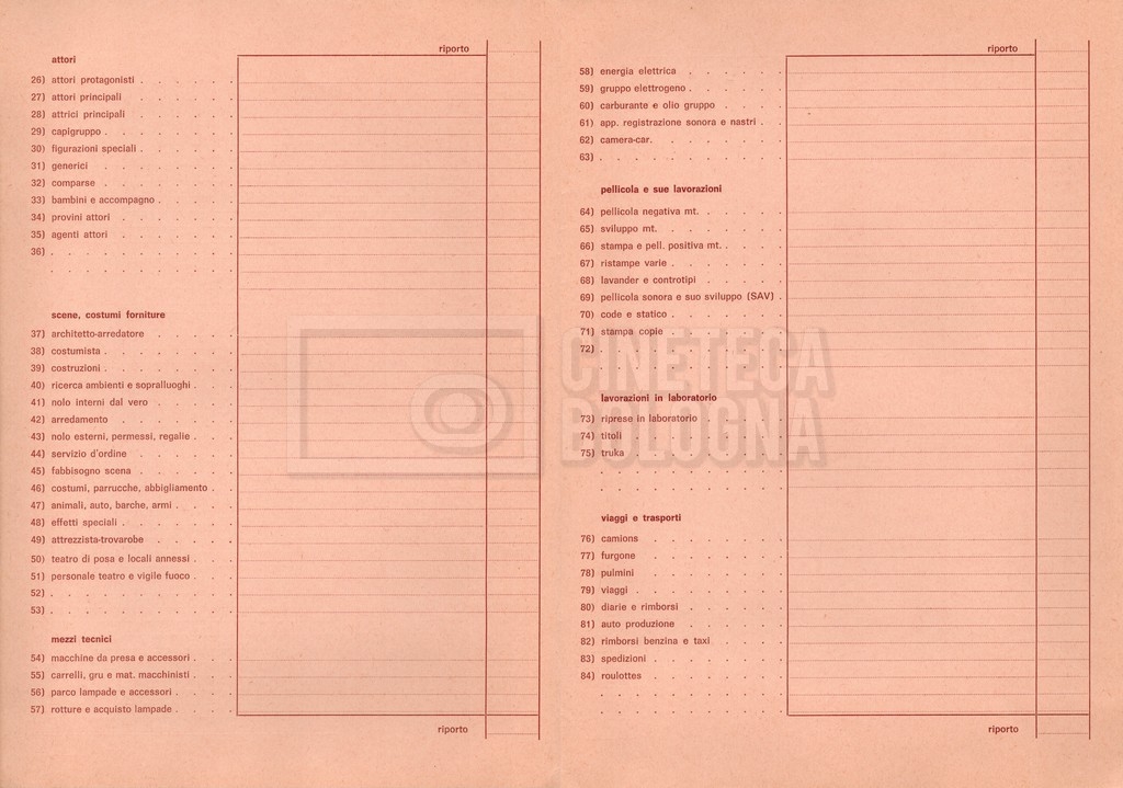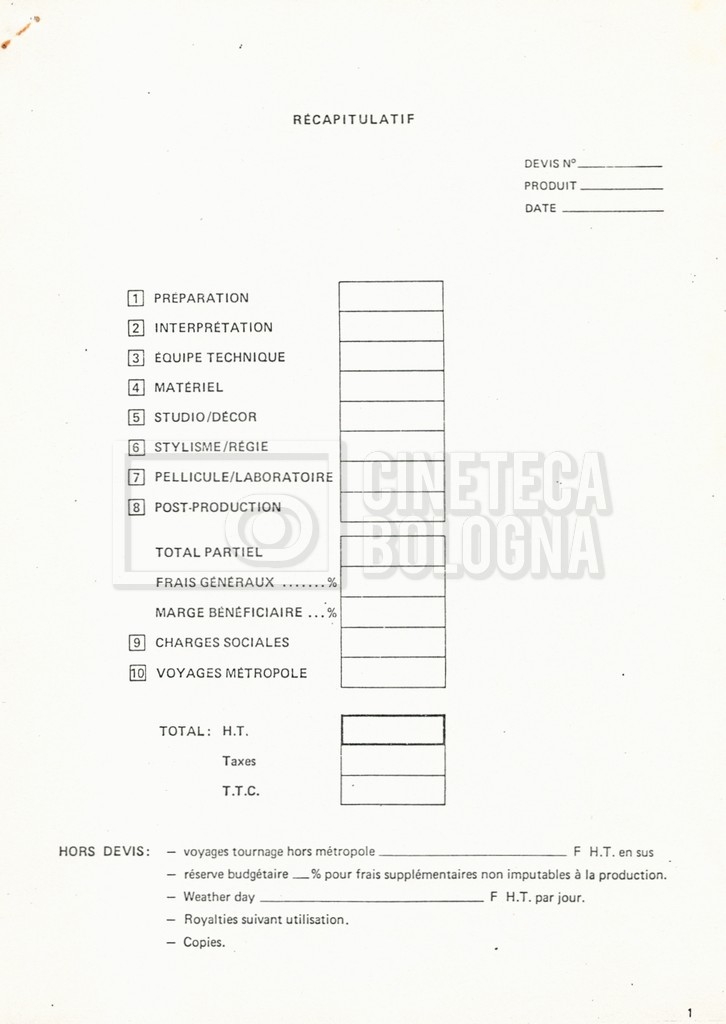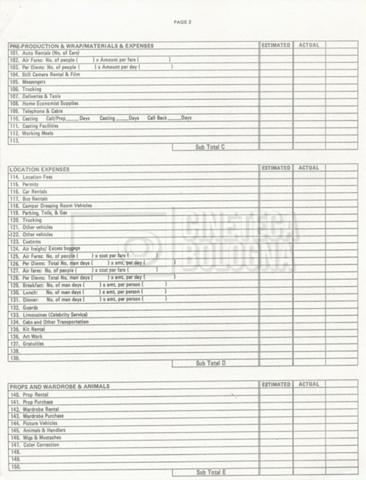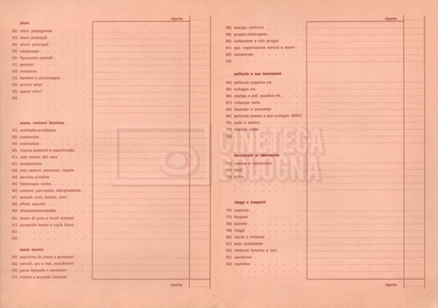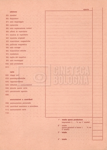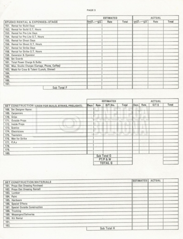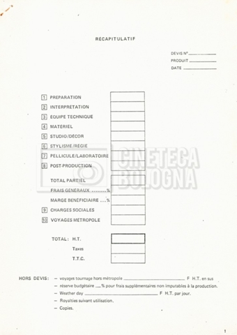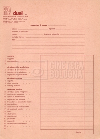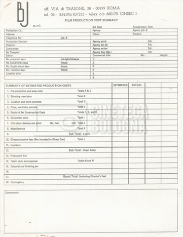 Contiene diversi moduli per la stima del budget di produzione di un film, in italiano e in inglese, tra cui alcuni di importanti case di produzione, come ’20th Century Fox’, ‘Confidential’, ‘Istituto Luce’, ‘Meltcalf Cooper’.