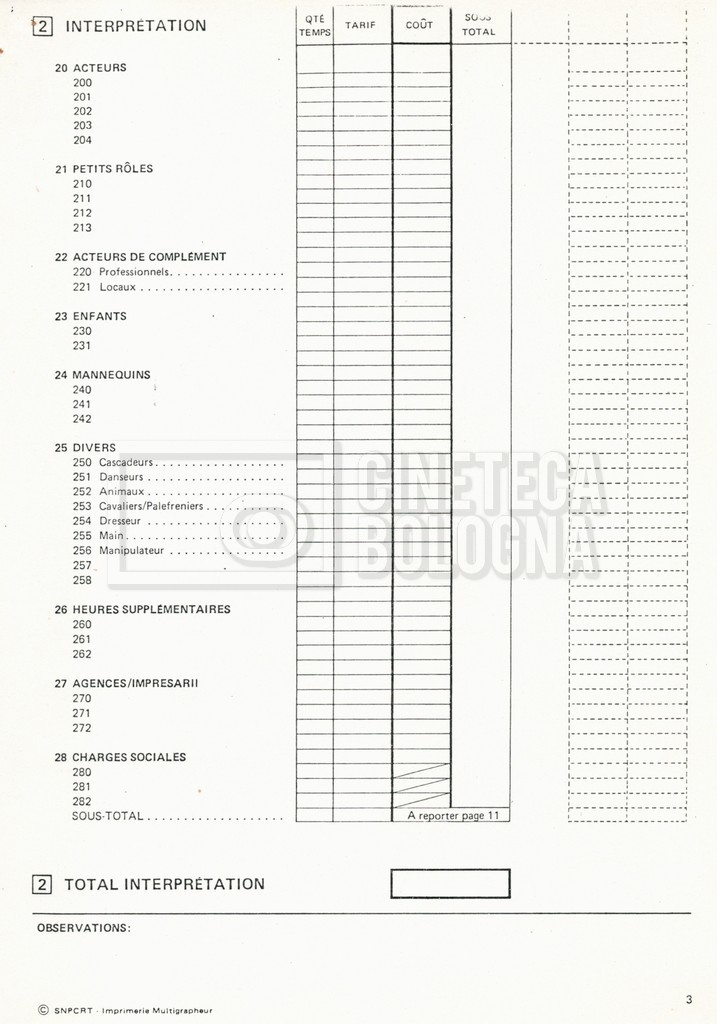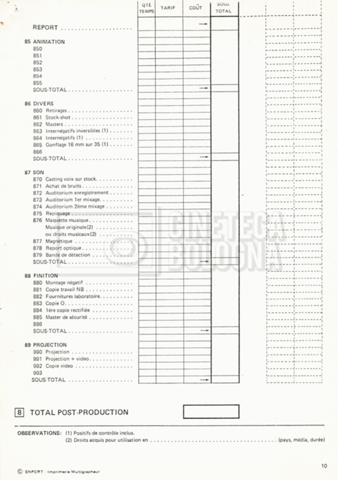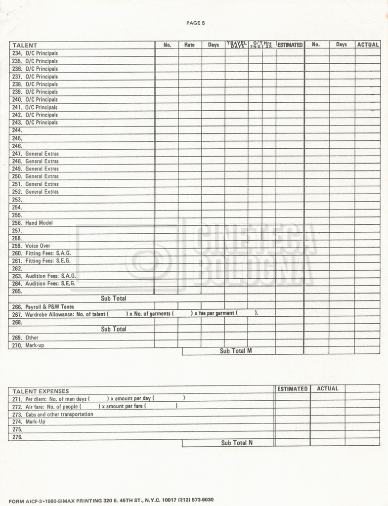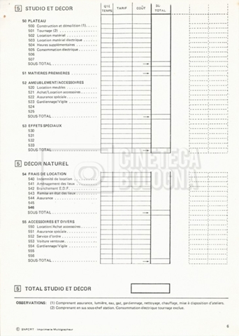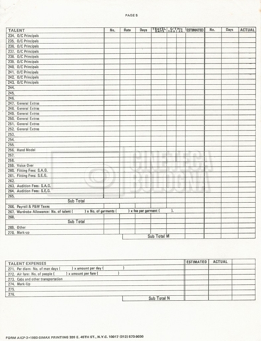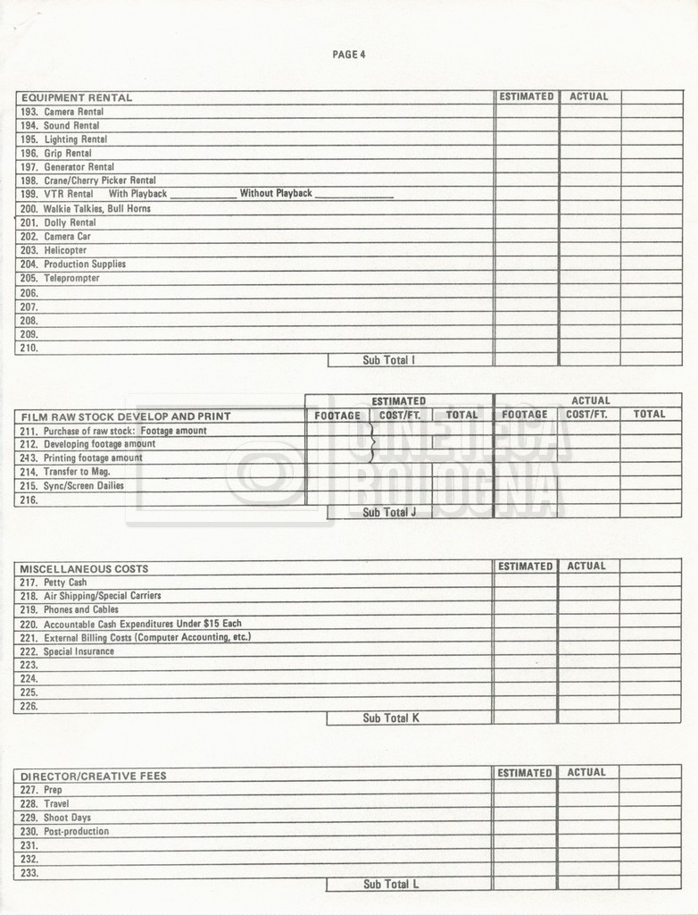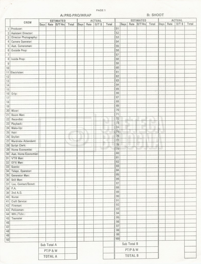 Contiene diversi moduli per la stima del budget di produzione di un film, in italiano e in inglese, tra cui alcuni di importanti case di produzione, come ’20th Century Fox’, ‘Confidential’, ‘Istituto Luce’, ‘Meltcalf Cooper’.