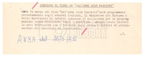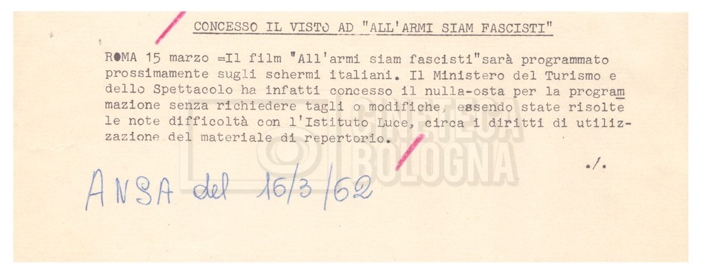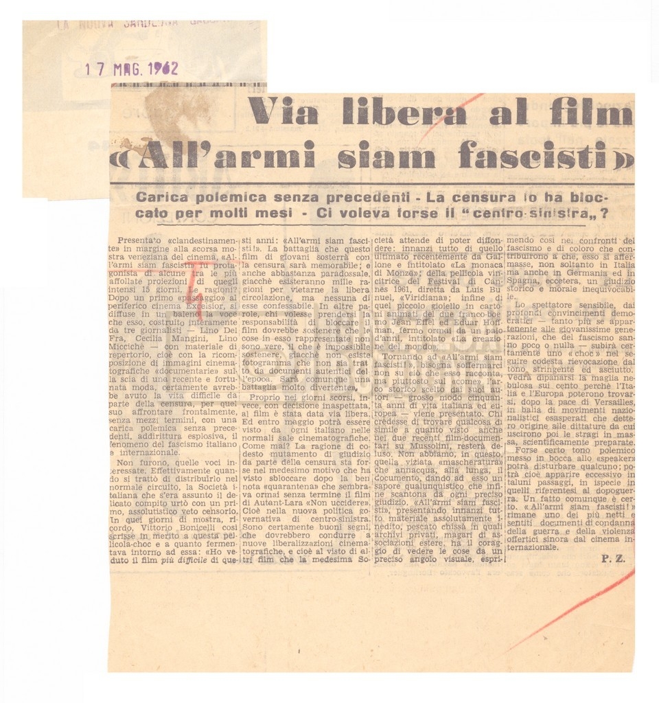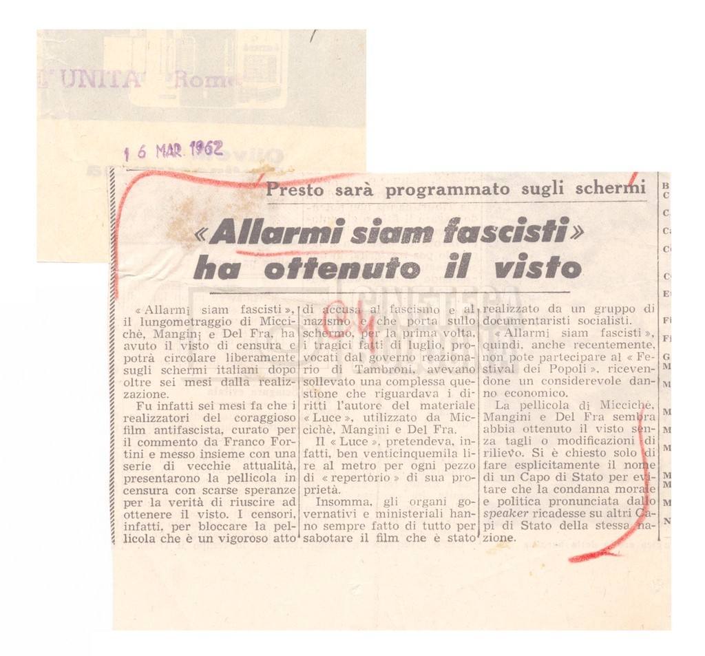 Contiene, oltra a rassegna stampa, un opuscolo della ‘Federazione comunista romana’ dal titolo “La censura contro il cinema italiano” (1962).