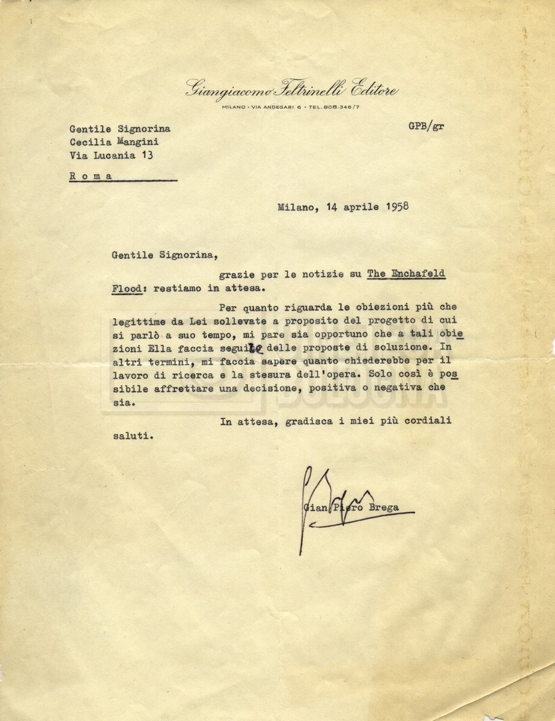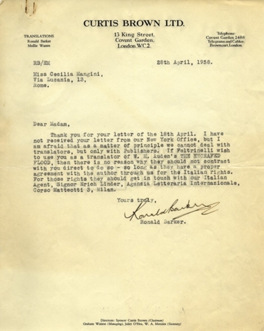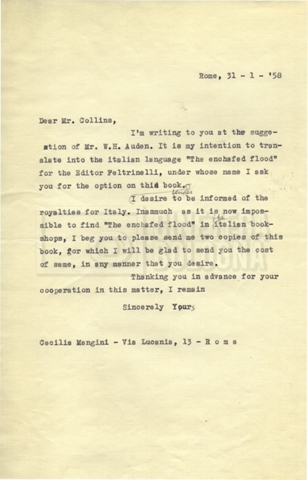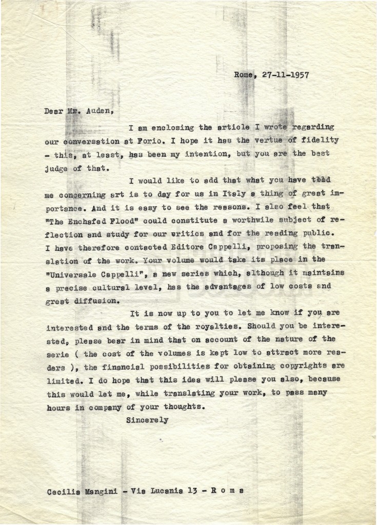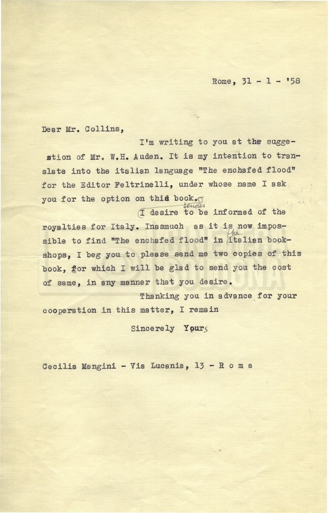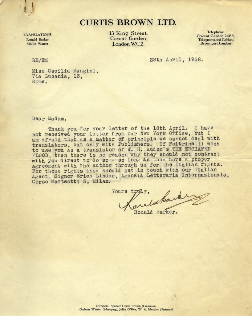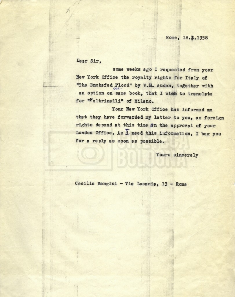 – Carteggio tra Cecilia Mangini, l’agenzia letteraria Curtis Brown e la casa editrice Feltrinelli per la traduzione di The enchafèd flood di W. H. Auden.