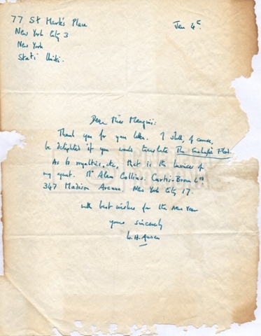 “Wystan Hugh Auden. Mio articolo; corrispondenza; sua lettera autografa; ipotesi di traduzione”
